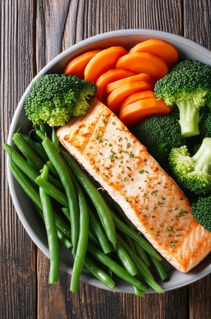 - 구운 연어와 찐 채소를 함께 담아 올리브 오일을 살짝 뿌려 드세요.
