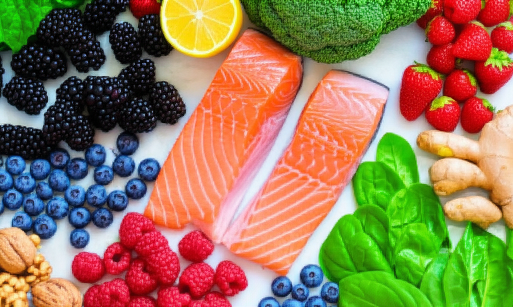 - 채소와 과일: 브로콜리, 시금치, 케일 등의 녹색 채소와 블루베리, 딸기, 체리 등의 과일은 항산화 물질이 풍부하여 염증을 줄이는 데 도움이 됩니다. 이러한 음식들은 활성산소를 제거하고 세포 손상을 예방합니다.